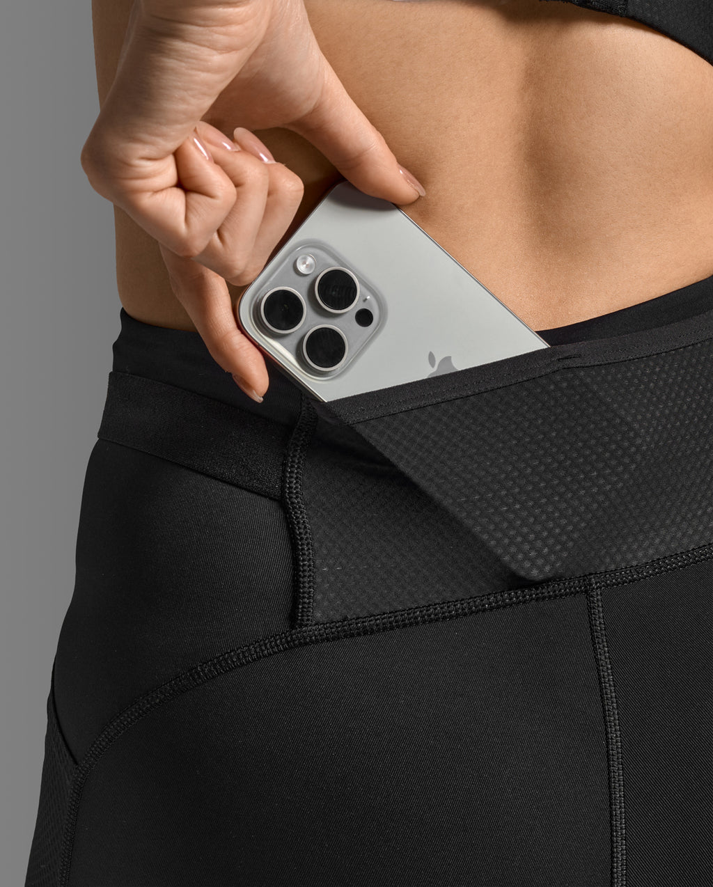 Hi-Rise power mesh -vyötärönauha vartaloa muokkaavaan turvalliseen istuvuuteen sekä takana mesh-puhelintasku, joka estää pomppimista ja joustavat lenkit juoksutopin tai urheilugeelien säilyttämistä varten.