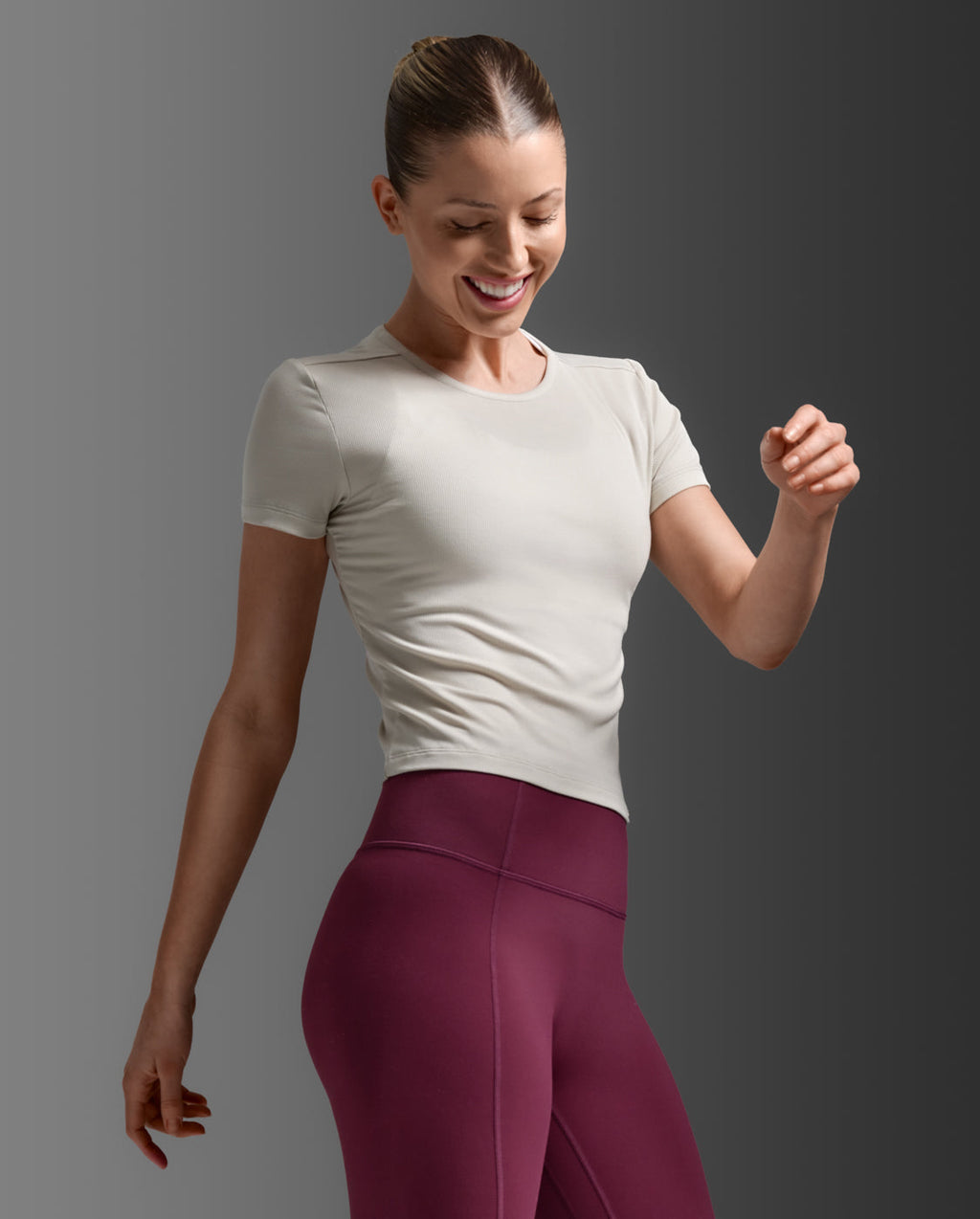 Poikkeuksellisen pehmeään, sileään modaaliin on sekoitettu ripaus spandexia, joka takaa maksimaalisen liikkumisvapauden, kun taas siluetti on muotoiltu kohtaamaan vyötärönauhaasi, jotta se ei pääsisi nousemaan ylös treenin aikana.