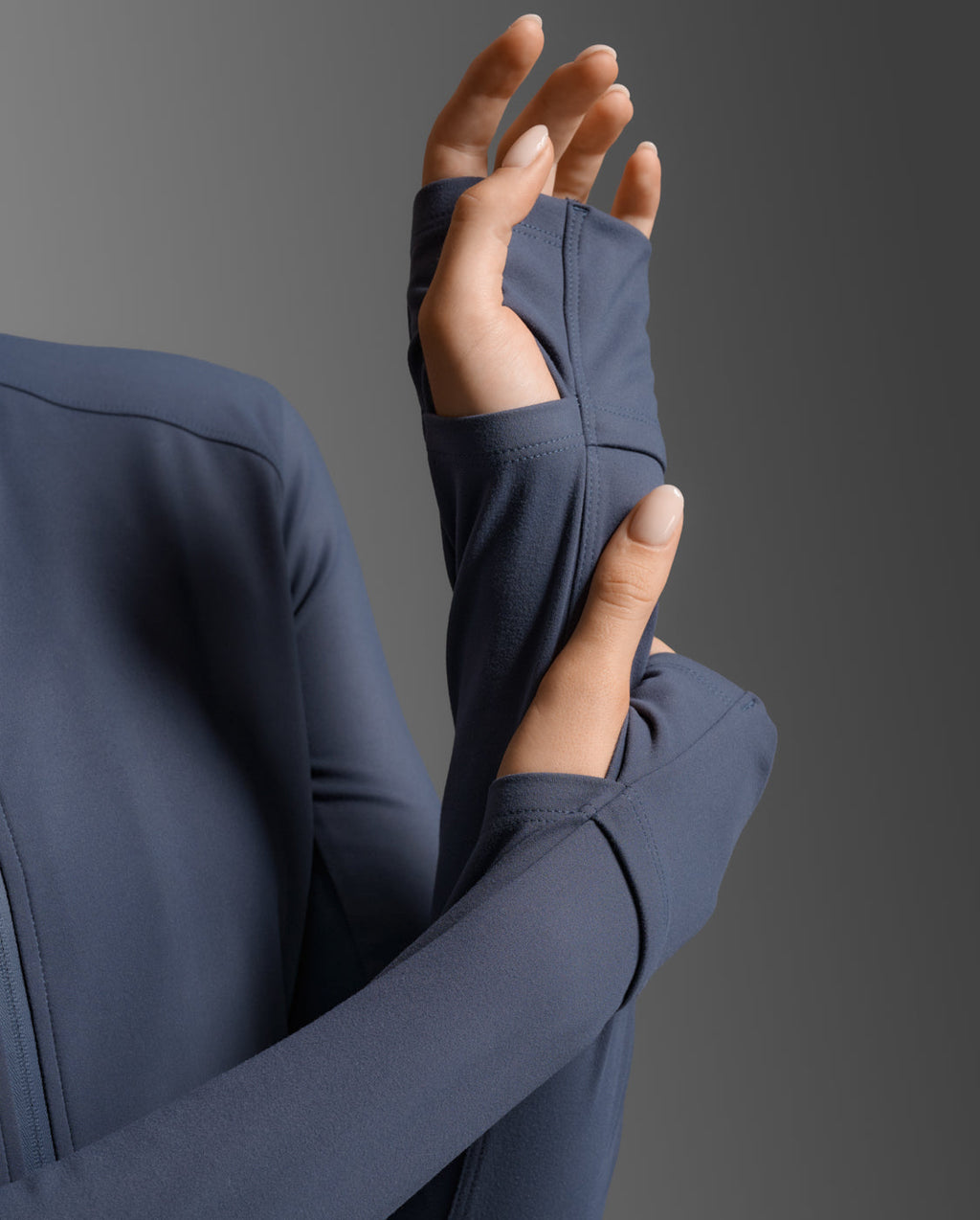 Pystykaulus ja hihansuut peukalorei'illä, jotka kääntyvät lapasiksi, pitävät kaulan ja kädet lämpiminä.